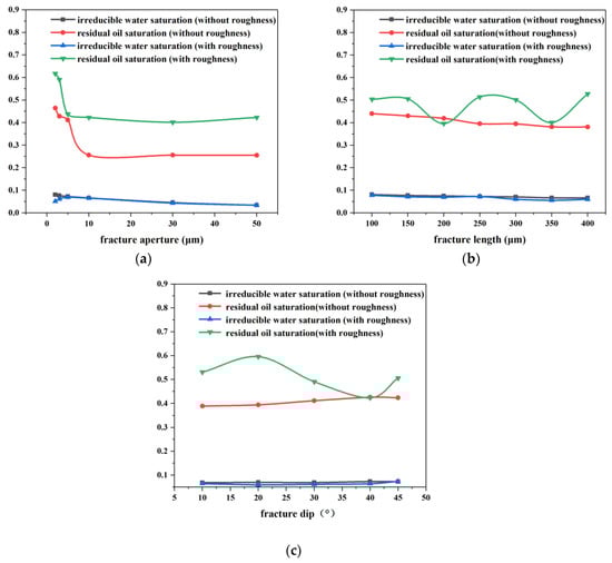 Irreducible water and residual oil saturation with different fracture apertures (a), lengths (b) and dip angles (c).