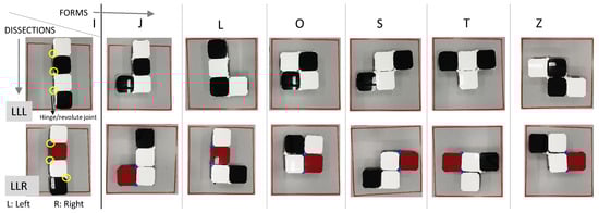 In the first reported work on hinged-Tetro [2], the hinged dissection of polyominoes was described in detail. Using theorems on hinged dissection in which using the lemmas it was proved that the hinged Tetromino (hTetro) can be dissected as {LLL, LLR, LRR, LRL, RLL, RLR, RRL, and RRR} [4,5]. It was proved that only LLL and LLR dissection could attain all the required one-sided transformations or forms named as {I, J, L, O, S, T, Z} on the basis of shape as shown in Figure 1. The one-sided polyominoes are distinct when none is a translation or rotation of another (geometry cannot be flipped over). Note that the two pairs, i.e., {L, J} and {S, Z}, of tetrominoes look very similar, but we cannot rotate one of them to get the other. In an extension of this work the nested reconfigurability and reported initial tests with hTetro-LLR without the dynamic modeling of the system [6].