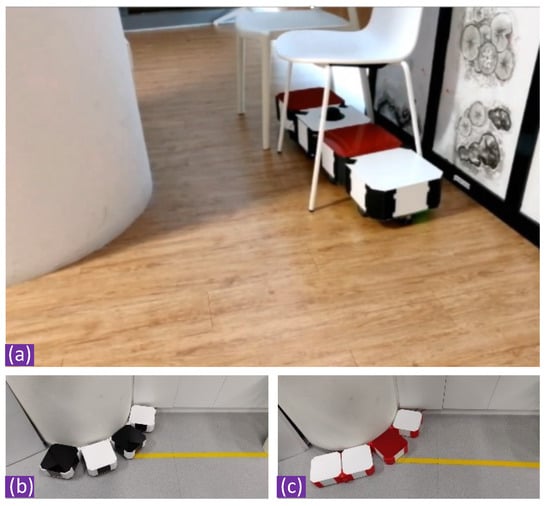 Functional modeling is a key step in the product design process, whether using the original or redesigns with the inductive approach [9]. Figure 2 depicts the advantages of the reconfigurable floor cleaning robot in terms of covering sharp edges, area coverage in an unknown environment. In this work, we have built the hTetro-LLL and hTetro-LLR, as shown in Figure 2b,c, respectively, with each of its block designed for higher payload using four omni-wheels. The four omni-wheels in each module will provide mechanical stability to the base along with the higher acceleration over the three omni-wheels [10]. The pavement sweeping robot with reconfigurability and differential wheels were presented in [11]. The matrices for analyzing the performance are, measurement of the covered area using computer vision technique and the distance covered by the cleaning robot [12] which depends on the energy consumption. To evaluate the optimal configuration of the self-reconfigurable robot which will help to improve power management will be extremely useful for energy-efficient performance.