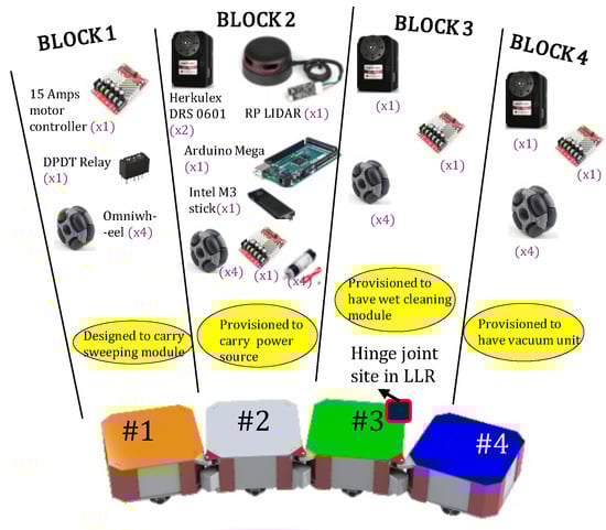 The hTetro is designed to reconfigure its shape in one of the forms, i.e., {I, J, L, O, S, T, Z}, to have a greater area coverage by accessing the narrow spaces by changing its shape and is also helpful in avoiding the collisions. This also opens a new field for tiling-based theories for the area coverage [20]. The hinged Tetromino (hTetro) has four identical blocks which are of cuboid shape. The cuboid shape of each block allows an easy intra-reconfiguration process while providing enough space to allocate appropriate sensors and modules. The internal ribbing in each block provides the necessary strength. The dimensions of the four blocks are as follows, namely, #1, #2, #3, and #4, having length and breadth equal to 250 mm and heights of 140 mm. Acrylic sheets having 4 mm thickness were used to cover the top and sides of the robot. In this work, we considered two sites for the hinge joint connecting the blocks #3 and #4, and on this basis, it is labeled as hTetro-LLL and hTetro-LLR. Figure 3 shows the system architecture of the hTetro-LLL with the hinge joint site for -LLR. Each block is responsible for a particular function as shown in Figure 3. These two geometries have a high potential for research in nested reconfiguration since it has the advantages of inter- and intra-reconfigurability that results in more complex morphologies. In this paper, we focus on assessing the intra-reconfigurability features of the two architectures of hTetro, which will assist in utilizing the architecture efficiently for the area coverage problem [7].