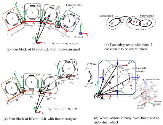 where for are the direction vectors of joint rotations. The second link length, , is the distance from link origin to . In this paper, we assume that the link 2 is not moving and can be assumed as clamped; therefore, the translational velocity due to locomotion of the hTetro . Considering and as the angular velocity and the linear velocity of the origin point, , of the ith link twist vector is defined as, . Next, due to the hinge rotation, as shown in Figure 4, the rotation of the passive wheels are discussed.