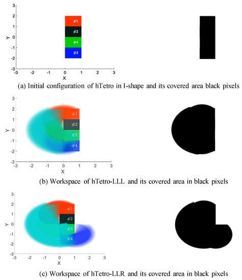 Here, we use a graphical approach to calculate the workspaces of the two dissections of hTetro, i.e., -LLL and -LLR. The assumption was made that block-2 is not moving or actuated while the reconfiguration takes place. This gives an idea of the possible area coverage from a given fixed configuration (here, I-configuration) as shown in Figure 5a. The steps for calculating the workspace are as follows. (a) Plot the initial configuration of the platform on the scale and convert it to binary image. (b) Estimate the correspondence between the pixel count and the black pixel count as per the dimension and is depicted in Figure 5a (here, 4-square block = 91773 black pixels). (c) Rotate each block as per their joint limits and calculate the workspace or covered area by counting the pixels. Here, for hTetro-LLL, the joint angle variations as , and , and for hTetro-LLR , and . The black pixel count corresponding to the hTetro-LLL was 294,235 pixels and for hTero-LLR was 377,280 pixels, both are shown in Figure 5b,c, respectively. It is concluded that hTetro-LLR has approximately greater workspace than the hTetro-LLL. This method is generic and can be used to calculate the workspace of any planar mechanisms with arbitrary shapes.