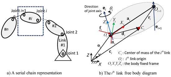 Euler’s and Newton’s equations of motion of the ith rigid link in a serial chain of Figure 6a are written from its free body diagram, shown in Figure 6b, as