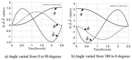 where are the coefficients that were derived from the initial and final state of the joints. The velocity and acceleration for linear actuation and rotation, i.e., , were found by taking the first and second order derivatives of Equation (16). The detailed trajectory equations with its derivatives [25]. This trajectory was used to actuate the joints from its initial to final position in time s. The hinge joint actuated from to and to are shown in Figure 7a,b, respectively. In this paper, we put a time constraint for reconfiguration from one form to another as s.