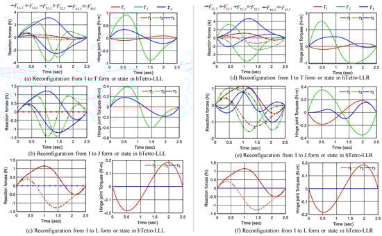 The joint reaction forces or shaking forces components denoted by , , and along with the three hinge torques as , and at the hinge joints during reconfiguration are shown in Figure 8. Note that is read as X-component of the force on block due to rotation of , as X-component of the force on block due to rotation of , and so on. We have shown only three states of reconfiguration for brevity. Meanwhile, the analysis was carried for all the 42 states transition and in simulation the transition from where are one of the seven states. Reconfiguration involving the hinge rotation of all three joints from {I to T} are shown in Figure 8a,d, for hTetro-LLL and hTetro-LLR. Reconfiguration involving hinge rotation of two joints from {I to J} are shown in Figure 8b,e and involving single rotation from {I to L} are shown in Figure 8c,f for hTetro-LLL and -LLR, respectively. Note that we have assumed that was kept stationary during reconfiguration. The shaking forces and moments from {I to L} for both the architecture were exactly the same and is evident as well because of the same magnitude of rotation of identical blocks. It was observed that the hTetro-LLR has higher shaking forces at its hinge joints due to the location of the hinge joints and the rotation directions during the reconfiguration. The torque and reaction forces in the hTetro-LLR were observed to be higher than hTetro-LLL.