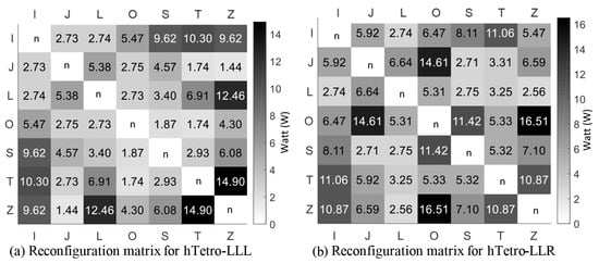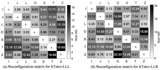 The power consumption during the reconfiguration of the two platforms was listed in matrix form in Figure 9a,b for hTetro-LLL and LLR, respectively. The table lists down the power calculated using Equation (18) for a fixed time interval of 2.5 s for the reconfiguration. The color scale in Figure 9 shows the higher power required during most of the reconfiguration from one state to another in hTetro-LLR than LLL. The critical cases with the highest power requirement are the transformations from {J to O} (14.61 watts), {Z to O} (16.51 watts), {O to S} (11.42 watts), and {Z to T} (10.87 watts) in hTetro-LLR. Similarly, in LLL, the transformation {L to Z} and {T to Z} showed the highest power required, i.e., 12.46 and 14.90 watts. Therefore, these transformations must be given least priority during the reconfiguration. The joint reaction forces components are also greater for the hTetro-LLR. The net reaction forces or the shaking forces will result in the overall system movement during reconfiguration, as the omni-wheels were used that has passive barrels as shown in Figure 4c. To avoid this, the mass of block was kept high to increase traction forces. To minimize the shaking forces and moments at hinge joints during the reconfiguration the center of mass of each block should be kept nearer to its hinge joint as dealt in [21,22]. The optimal distribution of mass in each block to minimize the shaking forces and moments will be of interest to study in future.