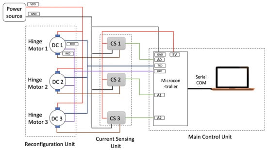 To assess the power consumption during reconfiguration in experiment, the two prototypes, nemely, hTetro-LLL and hTetro-LLR, were built as per the mechanical design discussed in Section 2. The servo motor used to drive the hinge joints was “Herkulex DRS 0601” and has the rated stall torque of 6 Nm. It has the maximum rated speed of rotation by 60 degrees per 0.164 s. The quintic trajectory at the joint were provided using the function written in the program for the reconfigurations. To measure the current consumed by servomotors at the hinge joints during operation, the current sensors (ACS 715) were connected in series as shown with circuit’s line diagram in Figure 10. The Arduino Mega board was used to command the servo motors for reconfiguration according to the Table 2. In Figure 10, VDD is the voltage across the motor, and the feedback from the motor is transmitted and received with port TXD and RXD, respectively. The joint angular positions and the current values were logged in the PC through USB. Figure 11 shows the variation of hinge joints angular position and current data logged during the reconfiguration.