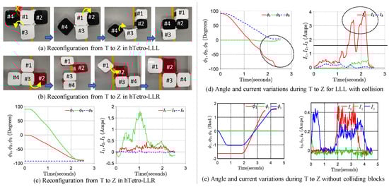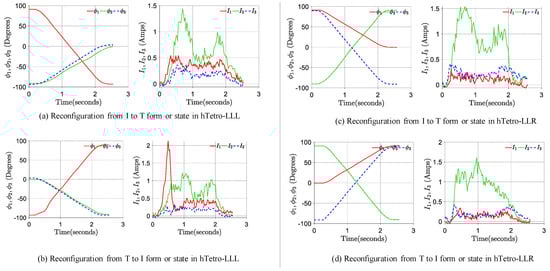 Angle and current variations for reconfiguration from I to T for hTetro-LLL and hTetro-LLR.