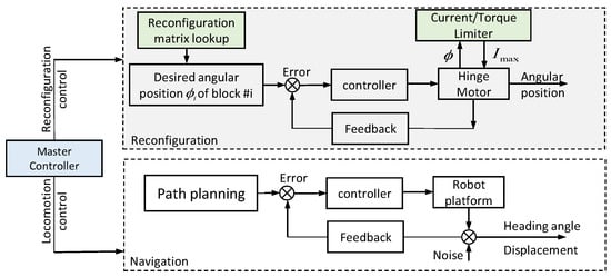 Energy-efficient operation is vital, as it reduces energy losses and transmission costs, boosts the duty time of the energy storage units, and gives an opportunity to reduce the capacity and price of such units. The approaches for electricity consumption characteristics and energy-saving possibilities for an industrial robot [15]. In terms of speed and energy consumption, it was reported that spherical configuration is superior to the joint arm, cylindrical, or rectangular design of industrial robot [16]. Energy savings becomes vital in wheeled mobile robot as it is supplied from the finite on-board source as batteries. The other aspects of energy saving in mobile robots with fixed morphology were presented [17,18]. It was reported that the energy consumed by the motor strongly depends on the trajectory profile to reach the desired speed on the given final time [19]. In this study, we analyze the power consumption in simulation and experiments by giving the joint trajectory profile for the reconfiguration in fixed time. To the best of the authors’ knowledge, this is the first time the energy consumption during the reconfiguration in a self-reconfigurable class of robots is assessed by modeling in a simulation and then performing the experiments.