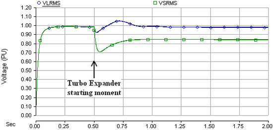 - Scenario 4: Turbo-expander start-up and occurrence of the unbalanced fault in the ASS (21 kV, 1-phase to ground) simultaneously.