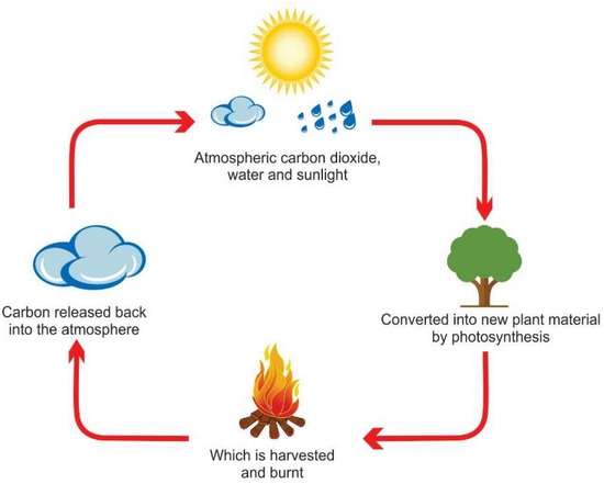 The usage of fossil fuels has increased rapidly since the 19th century due to the increased population and technological development in many countries; neither the population nor the technological development are able to be controlled, and the development of technology is important for sustaining society and the economy [1]. Many scientists are worried that due to their limited reserves, fossil fuels will become incapable of supporting global energy needs in the coming years [2,3,4]. The increasing price of fossil fuels is due to the high market demand, excessive use, and phasing out of fossil fuel based technologies which have caused climate change over a period of years [5,6,7,8]. It has been reported that global carbon dioxide (CO2) emissions increased from 30,295 million metric tons in 2008 to 33,234.8 million metric tons in 2018. In 2018, the largest CO2 emitter globally is the Asia Pacific region (16.27 billion metric tons of CO2 emissions, and China alone contributed 27% of the world total fossil fuel CO2 emissions) [9]. Currently, the coal industry dominates the Chinese power generation industry, especially in electricity production [10,11]. Malaysian power generation industries generally rely on fossil fuels. High consumption of fossil fuels for combustion processes in power generation increases the emissions of carbon dioxide (CO2) [12]. During the year 1990, there was an emission of 3.1 metric tons of CO2 per capita, whereas in 2011, it was 7.8 metric tons per capita, representing an increase of 155% in emission rate [13]. The major environmental and health issues of fossil fuels and increasing energy requirements have drawn attention from all over the world to the search for renewable fuels as these fuels are assumed to be neutral, as shown in Figure 1. During their development cycle, plants use photosynthesis to retain and change sunlight and carbon dioxide from the atmosphere into nutrients and energy. Therefore, when biomass is combusted as a power generation fuel, it does produce carbon, but the carbon dioxide is again absorbed by plants during the next crop cycle [14].