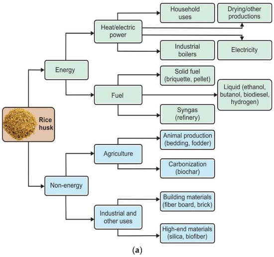 In general, agricultural wastes are biomass residues that can be divided into two categories, namely the crop residues and the agro-industrial residues. Crop residues can be further divided into different sub-groups, such as rice straw and rice husk. Rice husk is the outer layer of a rice seed. Rice husk is removed from the rice seed as a byproduct during the milling process. Rice straw is the stalk of the rice plant, which is left in the field as a waste product upon harvesting of the rice grain (i.e., the seeds of rice). Rice straw is produced when the paddy plant is cut at grain during harvest [48]. Rice straw actually makes up almost 50% of the clean weight of rice plants, and this may vary in the range of 40–60% depending on the method used during cultivation. Therefore, it is clear that almost half of the weight of the plant is contributed by the straw. Figure 2a,b shows the potential application of rice husk and rice straw for power generation.