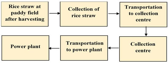 There must be a system established for each process, including collection, processing, and transportation of rice straw to the power plant. These systems could ensure that the cost of using machinery for harvesting and the quantity of rice straw could be determined. Drying is definitely required to reduce the moisture content in wet rice straw from 60–70%. It is necessary to wait for the moisture content to drop to 25% for complete combustion to be achieved. Apart from that, if the straw retains a high moisture content, the chance of fermentation increases, which would lessen the quality of the straw. It is more costly to transport wet rice straw compared to dry rice straw; this represents another reason that the drying process is necessary. Besides drying, rice straw should go through densification to increase the bulk density, which will reduce the logistical costs. Moisture content plays an important role in power generation; baled straw has a moisture content of 10–18%, and when the moisture content exceeds 13%, the power output is reduced by 2% for the same feedstock amount [119].