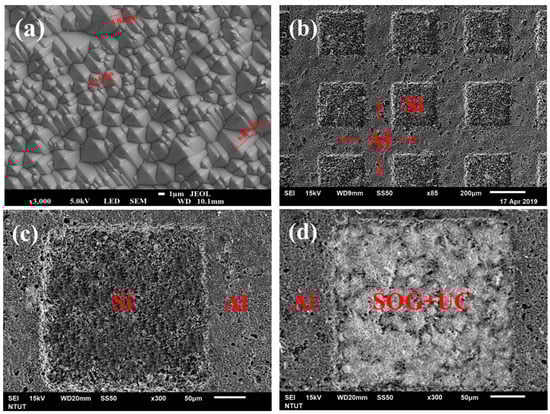 Top-view SEM images of (a) etched pyramidal surface, (b) etched matrix-grooves, (c) grooves without coating, and (d) grooves coated with the UC layer.