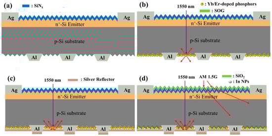 Schematic diagram showing (a) reference cell, (b) up-conversion (UC) cell, (c) UC cell with silver reflector (UC/Ag cell), (d) UC/Ag cell with In NPs embedded in SiO2 (plasmonic UC/Ag cell).