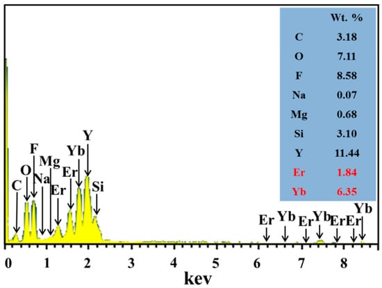 Energy-dispersive X-ray spectroscopy (EDS) spectrum obtained from SiO2 coating containing Yb/Er-doped yttrium oxide-based phosphors (YF3:Yb3+/Er3+).