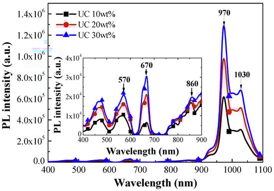 Photoluminescence (PL) emission spectra of SiO2 layer containing Yb/Er-doped phosphors (YF3:Yb3+/Er3+) at concentrations of 10, 20, and 30 wt%.