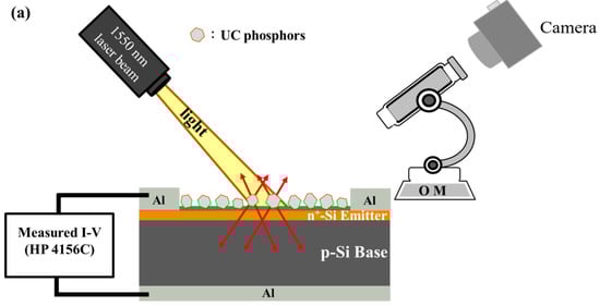 Before depositing an up-conversion layer, the silicon substrates (1 × 1 cm2) were subjected to ultrasonic cleaning using acetone (ACE) and isopropanol (IPA) and then rinsed in deionized (DI) water for 10 min and dried using high purity nitrogen gas. Three silicon substrates were respectively coated with an SOG (SiO2) layer containing Yb/Er-doped phosphors (YF3:Yb3+/Er3+) at concentrations of 10, 20, or 30 wt%. We fabricated a control sample in which the same substrate was coated with the same SOG layer but without phosphors. The deposition solution comprised 1.94 g of silicate solution (Emulsitone Company product, Whippany, NJ, USA) mixed with Yb/Er-doped yttrium oxide-based phosphors (New Prismatic Enterprise Company product, New Taipei City, Taiwan) at concentrations of 10, 20, and 30 wt%. The mixture was dropped onto the cleaned silicon substrates, where it remained for 12 s before undergoing spin-coating at 1500 rpm for 60 s. The coated samples were subsequently baked at 180 °C for 10 min on a hot-plate under an air atmosphere. Figure 1a presents a test sample with an up-conversion layer. We examined the surface morphology, chemical composition, and fluorescence emission of samples with an SOG layer containing Yb/Er-doped phosphors using scanning electron microscopy (SEM, Hitachi S-4700, Hitachi High-Tech Fielding Corporation, Tokyo, Japan), energy-dispersive X-ray spectroscopy (EDS, Hitachi S-4700, Hitachi High-Tech Fielding Corporation, Tokyo, Japan), and photoluminescence spectroscopy (PL, Ramboss 500i Micro-PL Spectroscopy, DONGWOO Optron, Korea).