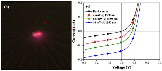 (a) Schematic diagram showing measurement set up to estimate up-conversion performance, (b) Optical microscope image showing red spot from Yb/Er-doped phosphors illuminated by laser diode with wavelength of 1550 nm and optical power of 5 mW, (c) I-V characteristics of proposed silicon solar cell coated with an Yb/Er-doped phosphors layer under dark illumination conditions using 1550 nm light source of variable power.