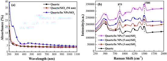 (a) Absorbance spectra of bare quartz substrate and quartz substrate coated with SiO2 layer containing In NPs of various sizes (3 nm, 5 nm, and 7 nm), (b) Raman scattering spectrum of bare quartz substrate and quartz substrate coated with SiO2 layer containing In NPs of various sizes (3 nm, 5 nm, and 7 nm).