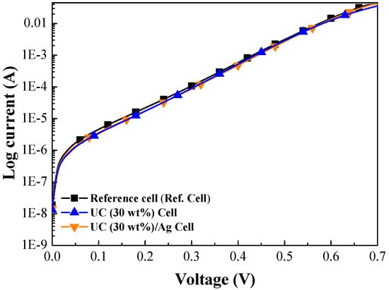 Dark I-V curves of the reference cell, UC cell, and UC/Ag cell.