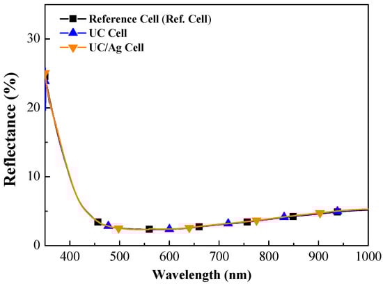 Optical reflectance of reference solar cell, UC cell, and UC/Ag cell.