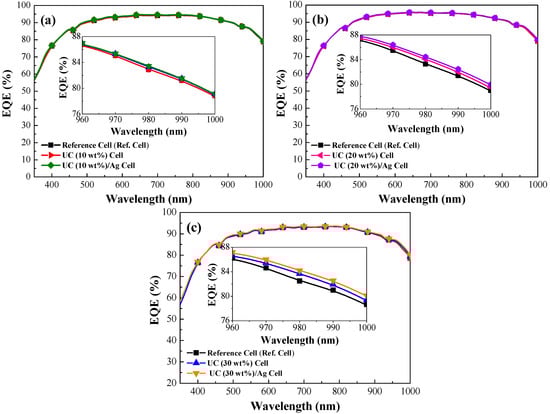 In this study, EQE data were obtained by adjusting the incident light from long wavelengths (1000 nm) to short wavelengths (350 nm). Figure 10 presents the EQE response of the reference cell, UC cell, and UC/Ag cell with phosphor concentrations of (a) 10 wt%, (b) 20 wt%, and (c) 30 wt%. The inset in Figure 10 illustrates the enhanced up-conversion performance at wavelengths between 960 and 1000 nm, in samples with various phosphor concentrations. The best EQE performance was obtained from the samples with a phosphor concentration of 30 wt%. Table 1 lists the average external quantum efficiency (EQEW) calculated at wavelengths between 350 and 1000 nm. For the sake of clarity, we calculated the EQEW of the cells as follows: