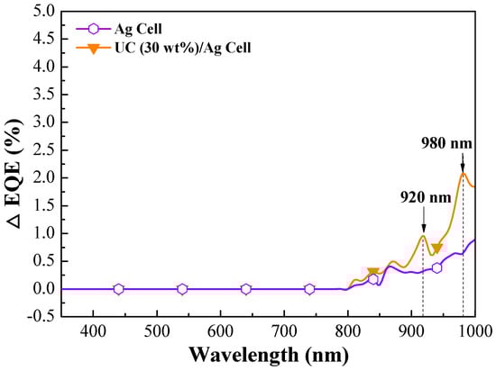 EQE enhancement (ΔEQE) of (a) reference cell with Ag reflector relative to that of the reference cell (violet line) and (b) UC/Ag cell at a phosphor concentration of 30 wt% relative to that of the reference cell (orange line).