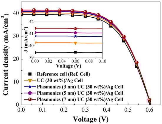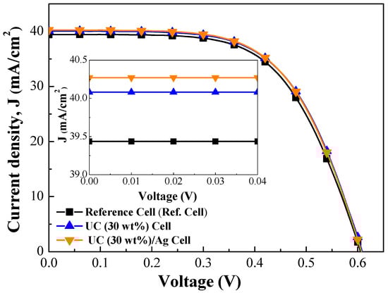 Photovoltaic J-V of reference cell, UC cell (30 wt%), and UC (30 wt%)/Ag cell.