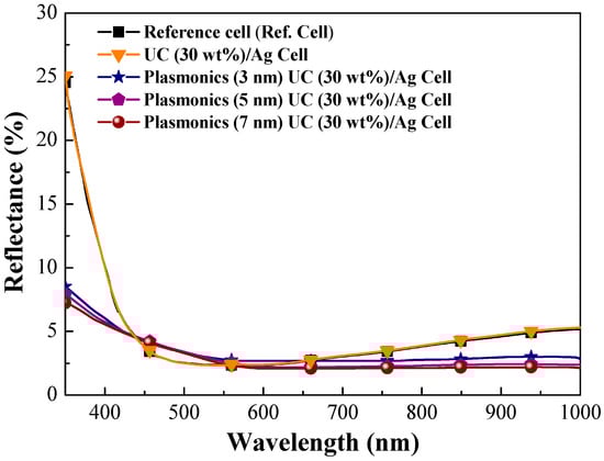Figure 13 presents the optical reflectance of the reference cell, UC (30 wt%)/Ag cell, and plasmonic UC (30 wt%)/Ag cell with In NPs (3 nm, 5 nm, and 7 nm). The reflectance of the plasmonic UC (30 wt%)/Ag cell was lower that of the reference cell and UC (30 wt%)/Ag cell at the wavelength ranges of 350-450 nm and 650-1000 nm. This can be attributed to plasmonic forward scattering induced by the In NPs. The lowest reflectance was observed in the plasmonic UC/Ag cell with In NPs (7 nm). The reflectance of the plasmonic UC/Ag cell was also slightly higher than that of the reference cell and UC/Ag cell (without a SiO2 layer on the front side) at wavelengths between 450 and 550 nm. This can be attributed to the fact that the SiO2/SiNx layer was not of optimal thickness, such that reflectance and destructive interference could not be minimized in this wavelength band. The RW values of the cells are listed in Table 1.