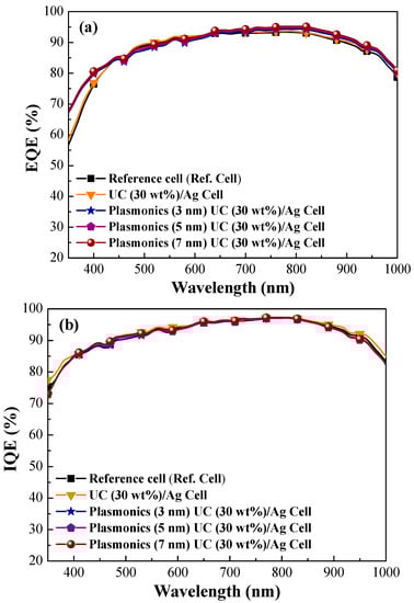 where EQERef is the EQE value of the reference cell, ΔEQEUC is the EQE enhancement attributable to the up-conversion layer, and ΔEQEUC+Scat is the EQE enhancement attributable to the up-conversion layer plus the plasmonic scattering layer. Table 1 lists the EQEW values of all cells evaluated in this experiment. The highest EQEW value (88.94%) was obtained from the plasmonic UC cell with In NPs of larger diameter (7 nm). Figure 14b presents the internal quantum efficiency (IQE) response of the reference cell, UC (30 wt%)/Ag cell, and plasmonic UC (30 wt%)/Ag cell with In NPs (3 nm, 5 nm, and 7 nm), illustrating the influence of plasmonic particles on cell parameters.