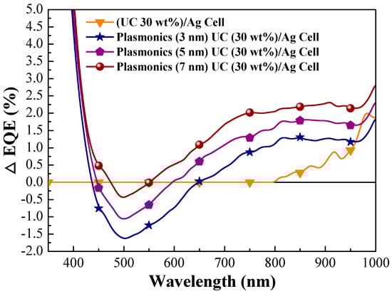 Figure 15 presents EQE enhancement (ΔEQE) spectra of the UC (30 wt%)/Ag cell and plasmonic UC (30 wt%)/Ag cell with In NPs (3 nm, 5 nm, 7 nm), versus the values obtained from the reference cell. The EQE response of the plasmonic UC (30 wt%)/Ag cell with In NPs exceeded that of the UC/Ag cell across a wide range of wavelengths, due to plasmonic scattering induced by In NPs and up-conversion by Yb/Er-doped phosphors. Note also that we observed a considerable increase in EQE due to the backscattering of photons by Yb/Er-doped phosphors in the plasmonic UC (30 wt%)/Ag cell with 7 nm In NPs.