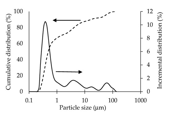 A high-calcium precursor, GBFS SMŠ 380 (39.8% CaO), produced by Kotouč Štramberk Ltd. was activated by water glass Susil produced by Vodní sklo a.s. GBFS is an industrial byproduct of iron production with a fineness of 380 m2∙kg−1 (Blaine). The average grain size of the slag particles determined by laser granulometry was d50 = 15.5 μm and d90 = 38.3 μm. Activation was performed by sodium silicate solution (water glass Susil MP 2.0 with a molar ratio SiO2/Na2O = 2.07). Three normalized CEN fractions of fine quartz sand (PG1, PG2, PG3) produced by Filtrační písky, Ltd., that complied with the ČSN EN 196-1 standard were used as a filler. The effective electrical properties of the composites were enhanced by CB VULCAN 7H. CB is essentially elemental carbon in the form of spherical particles and aggregated clusters of those particles with a high surface area and high electrical conductivity. The average grain size of CB particles was d50 = 0.52 μm and d90 = 17.6 μm. In Figure 1, the particle size distribution of CB VULCAN 7H determined by laser granulometry is presented.