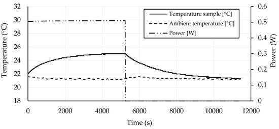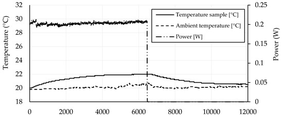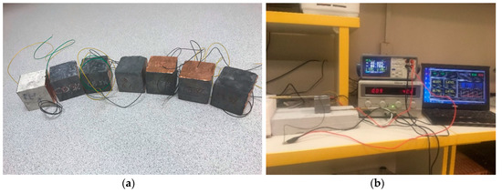 Self-heating experiments were performed on samples with dimensions of 50 × 50 × 50 mm3. Dried samples with electrodes attached in the same way as for determining the electrical properties were connected to a GW Instek GPR-11H30D voltage power supply and loaded by one or two voltage levels (Figure 2). Mortar samples CB 0 and CB 0.75 were loaded by 40 V to prove the no self-heating ability that was expected because of the electrical conductivity measurements. CB 1.25 mortar and mortars with higher amounts of CB were tested at two voltage levels, 40 and 100 V. Electrical power was monitored by a GW Instek GPM-8213 wattmeter. Ambient laboratory temperature and temperatures of samples were monitored by Pt-100 probes supported by Ahlborn ALMEMO 8690-9A datalogger in the central position of the bottom sides of the samples perpendicular to the attached electrodes.