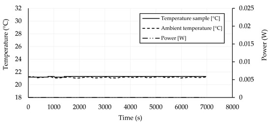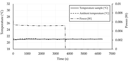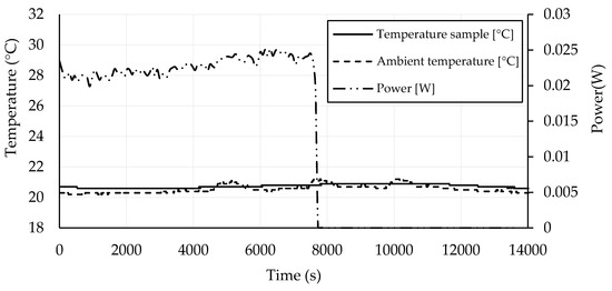 In Figure 3, Figure 4, Figure 5, Figure 6, Figure 7, Figure 8, Figure 9, Figure 10, Figure 11, Figure 12, Figure 13 and Figure 14, self-heating experiments are presented. Each self-heating experiment involved the determination of time dependencies of the ambient temperature, the temperature of the sample, and the power (dependent on power supply voltage and the passing current). Self-heating experiments conducted at 40 V on CB 0, CB 0.75, and CB 1.25 (Figure 3, Figure 4 and Figure 5) and at 100 V on CB 1.25 (Figure 6) confirmed the expectations obtained by measurements of electrical properties that such materials did not exhibit a self-heating ability. The passing current, which is directly proportional to the measured power P (W), was negligible or very low in evolving the Joule heat. Heating was not possible even after the voltage increased from 40 to 100 V.