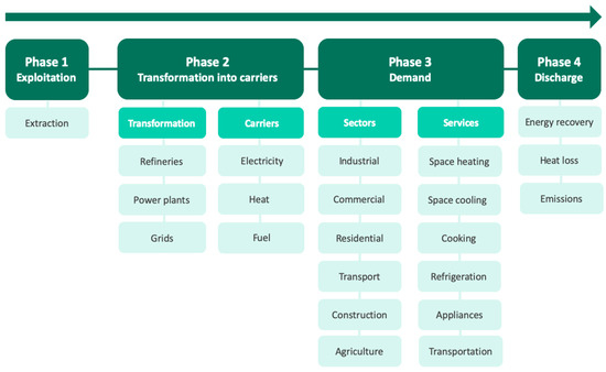 A city’s energy system can be conceptualized as depicted in Figure 1, which was adapted from Carreón and Worrell [20], Chen and Chen [27] and Zhang et al. [28]. Energy exploitation is the first phase of the system, which allows the identification of the source of the various energy flows. This phase includes all the mining activities for raw materials. In the second phase, energy is transformed into carriers. The physical infrastructure of grids, refineries, and power plants transform energy into the carriers of fuel, electricity, gas etc., which hold the energy.