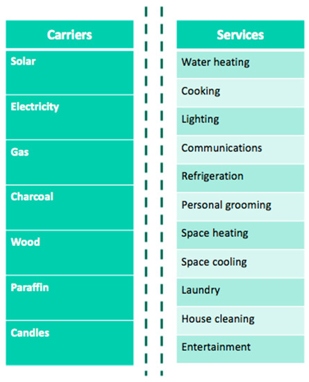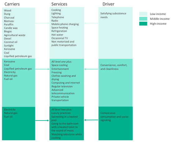 Sovacool [45] stressed that services also make it possible to identify the level of access of the household by a proposing an energy ladder. This energy ladder differs from the traditional energy ladder, which focuses only on carriers, and suggests that households transition to more efficient fuel types as their economic situation improves [48]. Sovacool’s [45] energy ladder includes three drivers to be applied to the various steps of the ladder: satisfying subsistence needs; convenience, comfort and cleanliness; and conspicuous consumption [45].