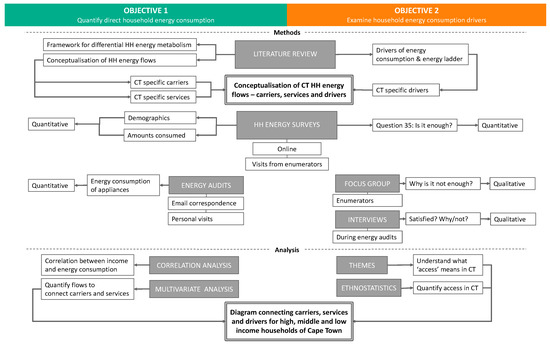 In order to develop a method for conducting a differential household energy metabolism assessment, this paper created two key conceptualizations. The first is that of Cape Town’s household energy flows in terms of carriers, services, and drivers, and the second illustrates the relationship between carriers and services in Cape Town households. In order to achieve this, various methods were used. Figure 3 illustrates the process and methods used to reach these conceptualizations.