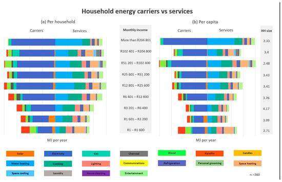 Figure 6 represents energy consumption based on activity for the household brackets using the average consumption per bracket. This consumption is divided into energy carriers (the left-hand side of each diagram) and energy services (the right-hand side of each diagram). Energy carriers indicate the total amount of activity for each carrier for each income bracket, while energy services indicate the end-use of energy for each bracket. This diagram provides a basic understanding of how the relationship between carriers and services changes with income. Figure 6a provides insight on the household level, and Figure 6b shows energy consumption per capita, which highlights the effect on average consumption as household size decreases and income increases.