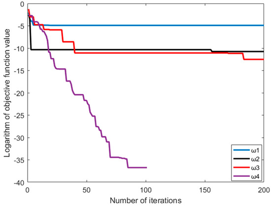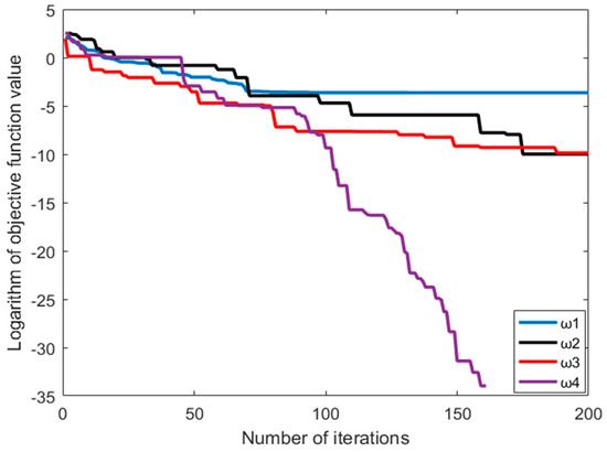 where is the biggest inertia weight; is the minimum inertia weight; is the current value of iterations; and imax is the maximum value of iterations. When the inertial weight varies from 0.9 to 0.4, the optimal searching effect can achieve the best solution [30]. For this reason, select ωmax = 0.9, ωmin = 0.4 and imax = 200. The variation of four inertial weights vs. iteration number is shown in Figure 1.