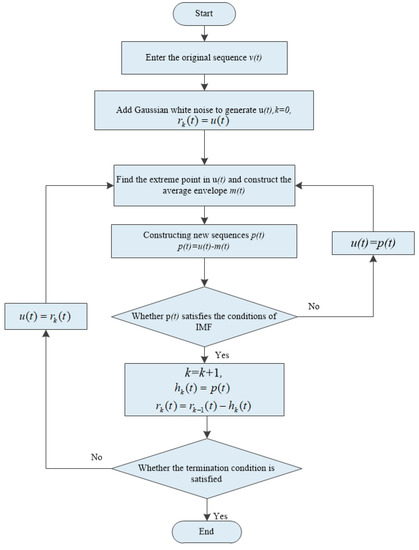 The EEMD is an improved EMD model [33]. Based on EMD, a set of Gaussian white noise with normal distribution is added, which effectively improves the aliasing and discontinuity of signals at different scales and avoids the mode aliasing caused by EMD decomposition process [34,35,36]. The flowchart of EEMD is shown in Figure 7, illustrated as follows: