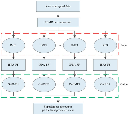 As shown in Figure 9, the frequency of each component is, in turn, from high to low, and the large fluctuation of high frequency component is the random influence part of wind speed. The low frequency component has the characteristics of a sinusoidal wave and is generally considered as the periodic component of wind speed. The symbol “RES” represents the trend component, indicating the long-term trend of wind speed. There are 10 decomposed sequences (IMF1, IMF2, …, IMF9, RES) input into the IFPA–FF model for training. After the training process is completed, these 10 predicted components are superimposed to obtain the final prediction value for comparison with the real value. The flowchart of the prediction model is shown in Figure 10.