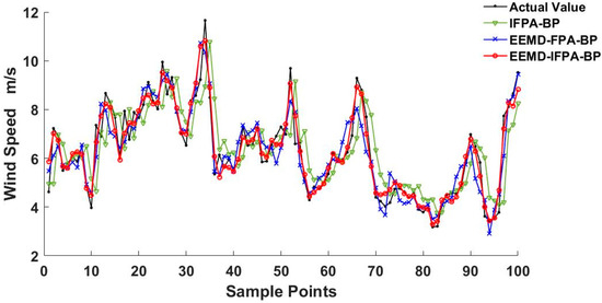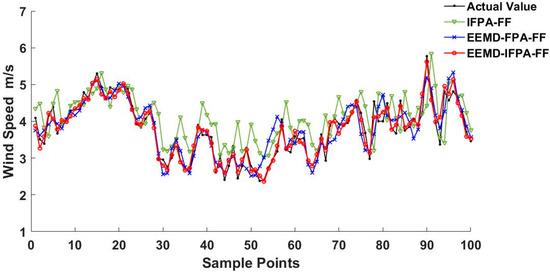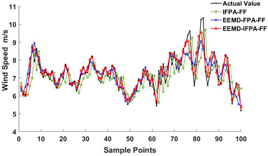 From 1 March to 13 March, a total of 1872 samples were used for model implementation. After EEMD decomposition, 1772 samples of each IMF and RES were trained, and the last 100 samples were used to judge the prediction efficiency. Three models, i.e., EEMD–IFPA–FF, EEMD–FPA–FF and IFPA–FF, were evaluated and compared using the same wind speed data. The comparison between the predicted wind speeds and actual ones on 13 March is shown in Figure 11. It reveals that the predicted curve from EEMD–IFPA–FF model is relatively closer to the actual one than others.
