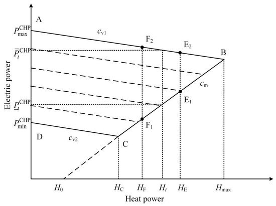 From Figure 1, it can be seen that there is a coupling relationship between the electricity output and the heat output of CHP units. The abscissa indicates the heating power of the unit and the ordinate indicates the generating power of the unit. When the heat power output of the unit increases from HF to HE, the adjustable range of the electric power output decreases from F1F2 to E1E2, the minimum power output increases, the maximum power output decreases and the adjustable range decreases. The operation range shown in Figure 1 can be expressed mathematically as follows: