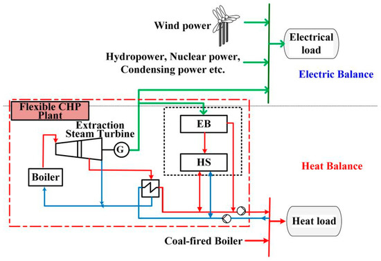 To support the integration of wind power, China is updating CHP units to decouple thermal and electric outputs and further reduce minimum electricity output of CHP units [3]. The main way of flexibility transformation is to install heat storages (HS), electric boilers (EB) on CHP plants [4], such as a 260 MW solid electric heat storage down-regulation boiler build on Dandong Jinshan CHP plants [5], three 16.7 MW direct heating electric boilers build on Jilin CHP plants [6], two 50 MW immersion-type electrode boilers build on Datang Harbin No.1 CHP [7], and a 26,000 cubic meter hot water storage tank build on Datang Liaoyuan Power Plant. Although heat pumps are more efficient than electric boilers, however in northern China, there is currently no case of applying heat pump to decouple thermal and electric outputs to increase flexibility in CHP plants, nor in future flexibility transformation plans, as described in Reference [4], probably because of more expensive cost than electric boiler, significant efficiency reduction under the very cold weather, and limited utilization hours.