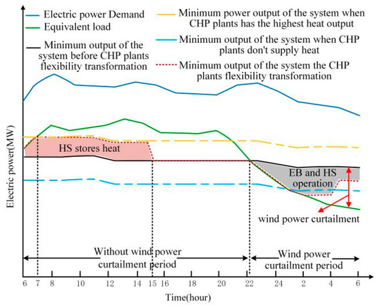 As mentioned above, the key to calculating the wind power curtailment is the minimum electric power output of the system, which is obtained by summing the minimum electric output of each power supply. For CHP plants, the minimum electric power output is determined by the current heat demand before flexibility transformation as Figure 1. After flexibility transformation, the minimum electric output of the CHP plants can be reduced by the coordinated operation of the generator, HS and EB. Therefore, the minimum electric power output of the system is reduced (as shown by the red dotted line in Figure 4) to adopt more wind power.