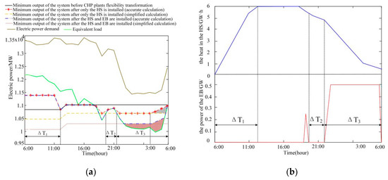 In order to validate the model, an accurate power balance diagram (Figure 6a) and an operating state diagram (Figure 6b) of the HS and EB are used to show the coordinated operation of the CHP unit, the HS and the EB. In the period of Figure 6a, there is no wind power curtailment and the HS is not full. At this time, in order to make full use of the remaining power generation space for co-generation heating and storage heat for the HS, the unit will increase the electric power output to more than heat-led mode, and the heat in the HS will gradually increase until it is full. During the period , there is wind power curtailment which does not exceed the minimum electric power output of the system after the operation of the HS. At this time, only operating the HS can realize the total wind power integration. Therefore, the electric power output of the CHP unit is reduced to less than heat-led mode through the HS releasing heat, the operation power of the EB is 0. During the period , the wind curtailment exceeds the minimum electric power output of the system after the operation of the HS. At this time, the EB needs to be started. But when the power of wind curtailment exceeds the minimum electric power output of the system after the operation of the EB, which means the EB has been running at the maximum power, the remaining wind power cannot continue to be consumed, as shown in the red shadow area in Figure 6a. The above-coordinated operation process is consistent with the theoretical analysis, which verifies the validity of the model.