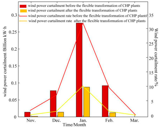 It can be seen that with the increasing proportion of the installed capacity of wind power, the rate of the wind power curtailment will increase before and after the implementation of flexible CHP plants.