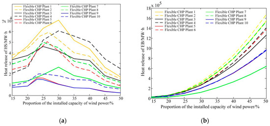 In order to analyze the influence of wind power installed capacity changes on the utilization degree of the HS and the EB, this section sets the capacity of the HS and EB to infinity. The heat release of the HS and the EB during the heating period is calculated by changing the proportion of the installed capacity of the wind power in the power structure.