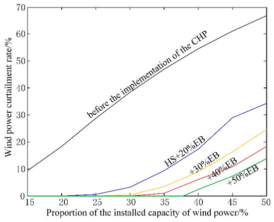 In order to analyze the potential of wind power integration after the implementation of all flexible CHP plants in the system, the rate of the wind power curtailment under different installed capacity of EB (the parameters of HS are the same as Section 5.2.2) is calculated and analyzed when the installed capacity of wind power increases from 15% to 50%, as shown in Figure 9.